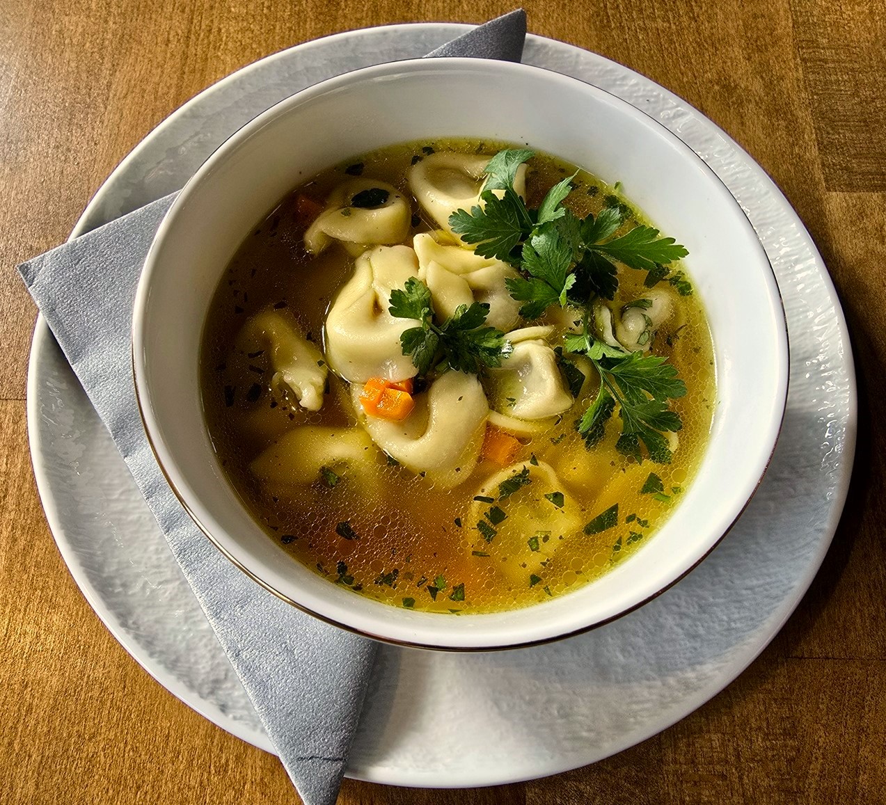Domowy rosół na kurze i wołowinie, tortellini z mięsem, pietruszka marchew.