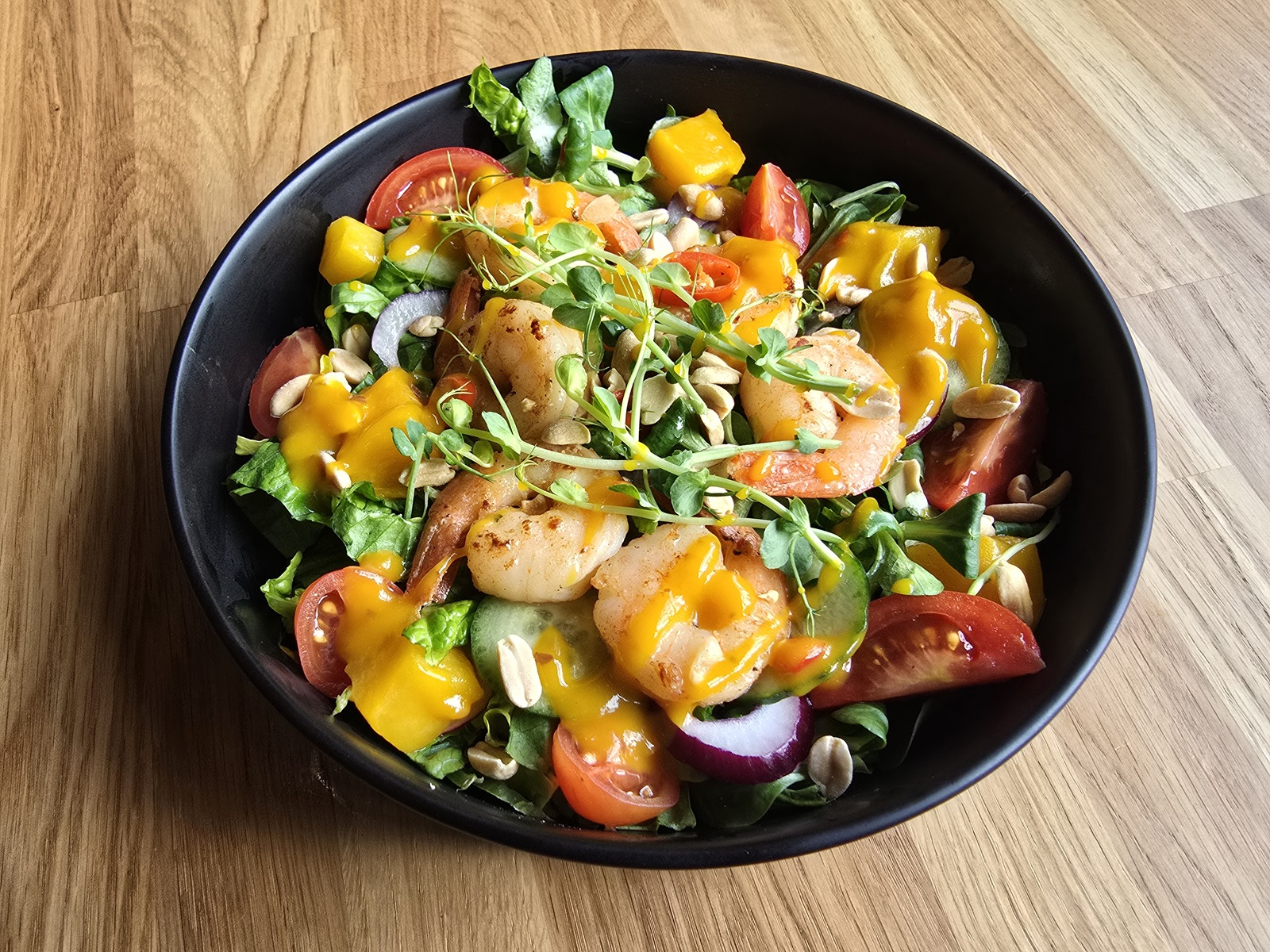 krewetki 6 szt. roz.16/20, sałata, ogórek, pomidorki koktajlowe, sos mango, orzechy ziemne, grzanki