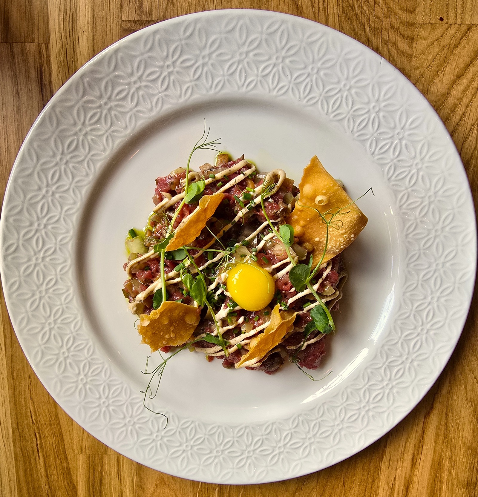 polędwica wołowa 100 gr , cebula, ogórek, rydze marynowane, majonez